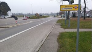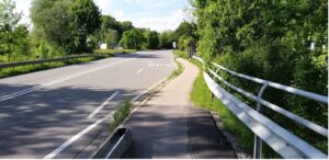 Beispiel Staudham: wie in vielen Fällen endet die Fahrstreifenbegrenzung hier erst unmittelbar vor der abgehenden Fahrbahn Richtung Edling.