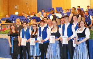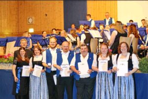 Auf dem Titelbild zu sehen sind die Träger der Leistungsabzeichen Silber und Bronze. von links Carolin Stübl (1. Vorstand), Christoph Danner (Bezirksdirigent), Felix Fischer (Tenorhorn), Simon Bichler (Flügelhorn), Marlies Fischer (Klarinette), Luca Rieger (Trompete), Florian Hainz (Bariton), Josef Bichler (Posaune), Hanna Joppich (Trompete), Matthias Lewik (Waldhorn), Leo Schneid (Trompete), Anton Hörmann (Saxophon) und Michaela Haindl (Dirigentin)