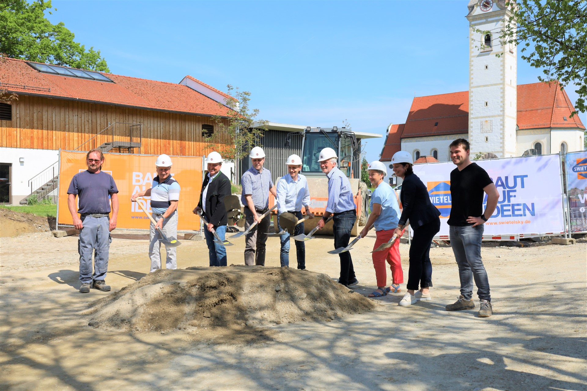 Ein Multifunktions-Dorfplatz – davon träumen die Bürgerinnen und Bürger in Vogtareuth im Landkreis Rosenheim schon lange. Ganz offiziell ertönte nun der Startschuss für das größte Projekt im Rahmen der Dorferneuerung bei einem gemeinsamen Baustellentermin der Vorstandschaft der Teilnehmergemeinschaft (TG) und der Gemeinde. Urlaubsbedingt wurde Bürgermeister Rudolf Leitmannstetter durch den zweiten Bürgermeister Johann Bürger-Schuster vertreten.