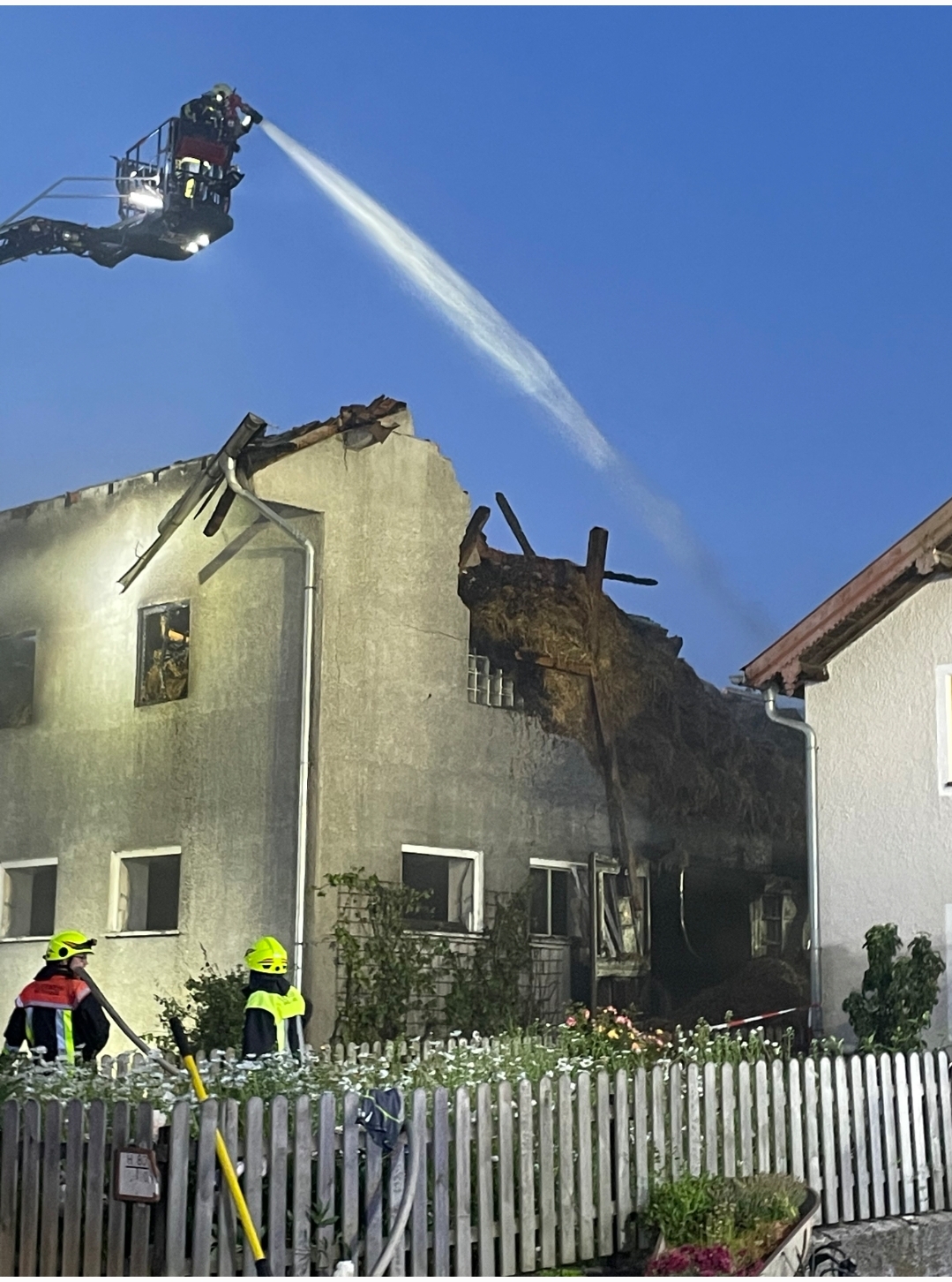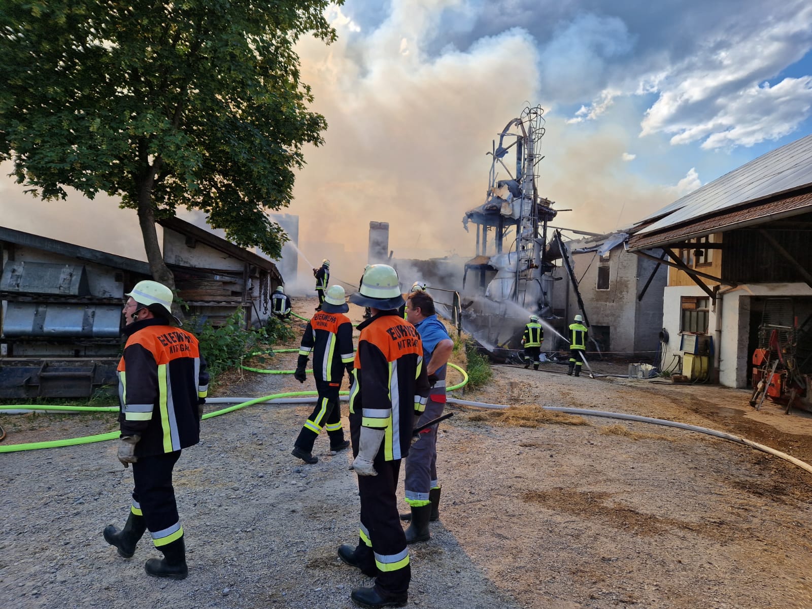 Dort, wo ein Hochsilo stand, positionierten sich kurz nach der Alarmierung die Einsatzfahrzeuge. Mithilfe von Drehleitern und Atemschutzgeräteträgern wurde von allen Seiten auf die glühenden Holzpfosten und brennenden Vertäfelungen Löschwasser gezielt. Die Blumen im schönen Bauerngarten und auf der Terrasse sind kein Blickfang mehr. Das ganze Dorf hat nur noch Augen für den Brandschaden und hilft zusammen.