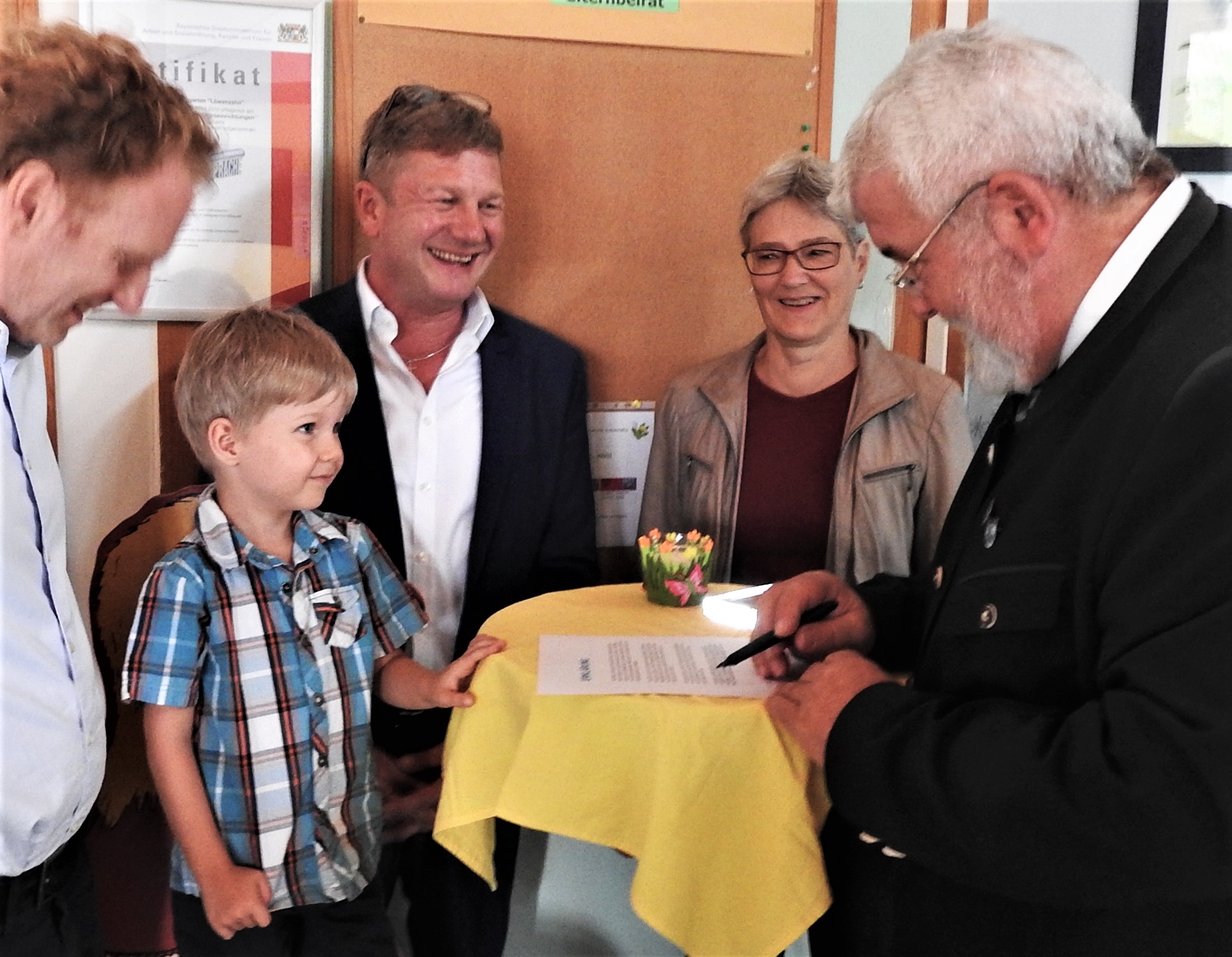 Im Beisein von Lisa Krininger als Vertreterin des Pfaffinger Kita-Elternbeirates und Pfaffings Bürgermeister Josef Niedermeier überreichte heute der Kita-Bub Konstantin Glas den Award – im Auftrag von